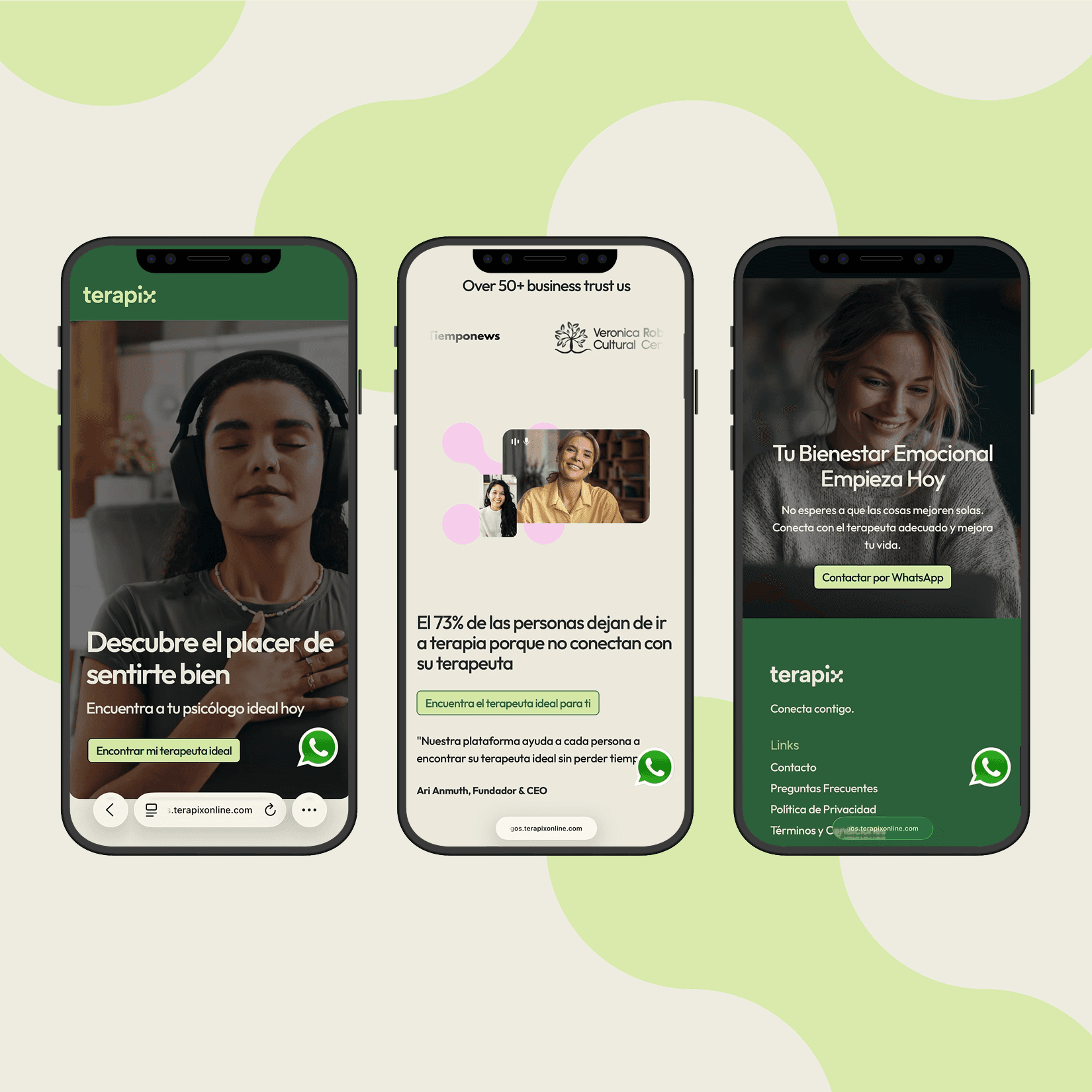 Terapix is an online platform that connects clients with Spanish speaking therapists across Latin America. The project focused on redesigning the website and refining the identity to create a clearer, more supportive experience across devices.